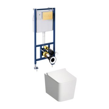 Setul include toaleta suspendata Omnires Tampa cu capac softclose si sistemul de cadru ascuns Omnires Classic cu o placa de bord aurie.